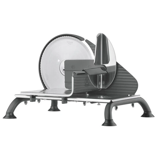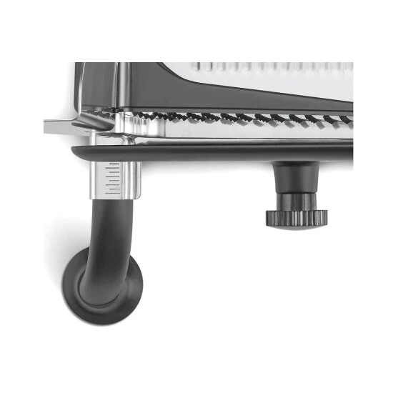 Der abnehmbare Edelstahlschlitten, die ebenfalls aus Edelstahl gefertigte Schlittenführung sowie die Vollmetallausführung dieses Allesschneiders sorgen nicht nur für eine edle Optik dieses Geräts, sondern erleichtern auch die Reinigung enorm.