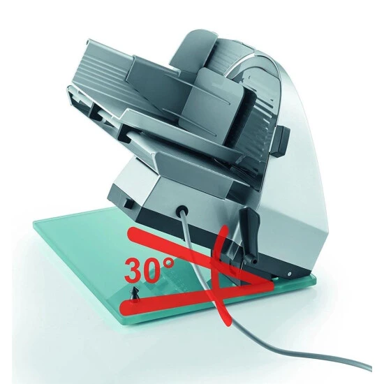 30° kippbar Durch die Kippfunktion des Allesschneiders von 30° kann das Schneidgut perfekt mit dem mitgelieferten Edelstahltablett aufgefangen werden.