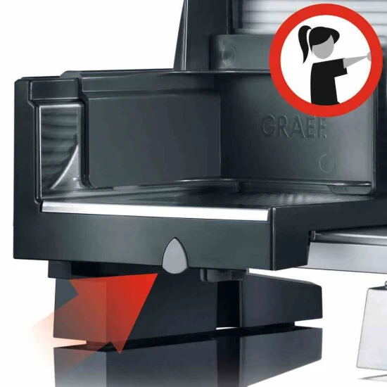 Der Graef Allesschneider Vivo in Silber besitzt ein gezahntes Edelstahlmesser mit 17 Zentimeter Durchmesser, welche in Deutschland gefertigt werden. Das Messer bietet die Schnittstärkeeinstellung von 0 bis 20 Millimeter. Der Allesschneider wurde vollständig aus Metall gefertigt und ist mit einem Standfuß ausgesattet. Durch seinen flüsterleisen Kondensatormotor kann angenehm gearbeitet werden. Zur Sicherheit sind ein Überlastungsschutz, eine Kindersicherung durch Schlittenfeststellung und ein Restehalter mit Fingerschutz eingebaut. 10 Minuten, Überlastungsschutz, Kindersicherung durch Schlittenfeststellung, Restehalter mit Fingerschutz